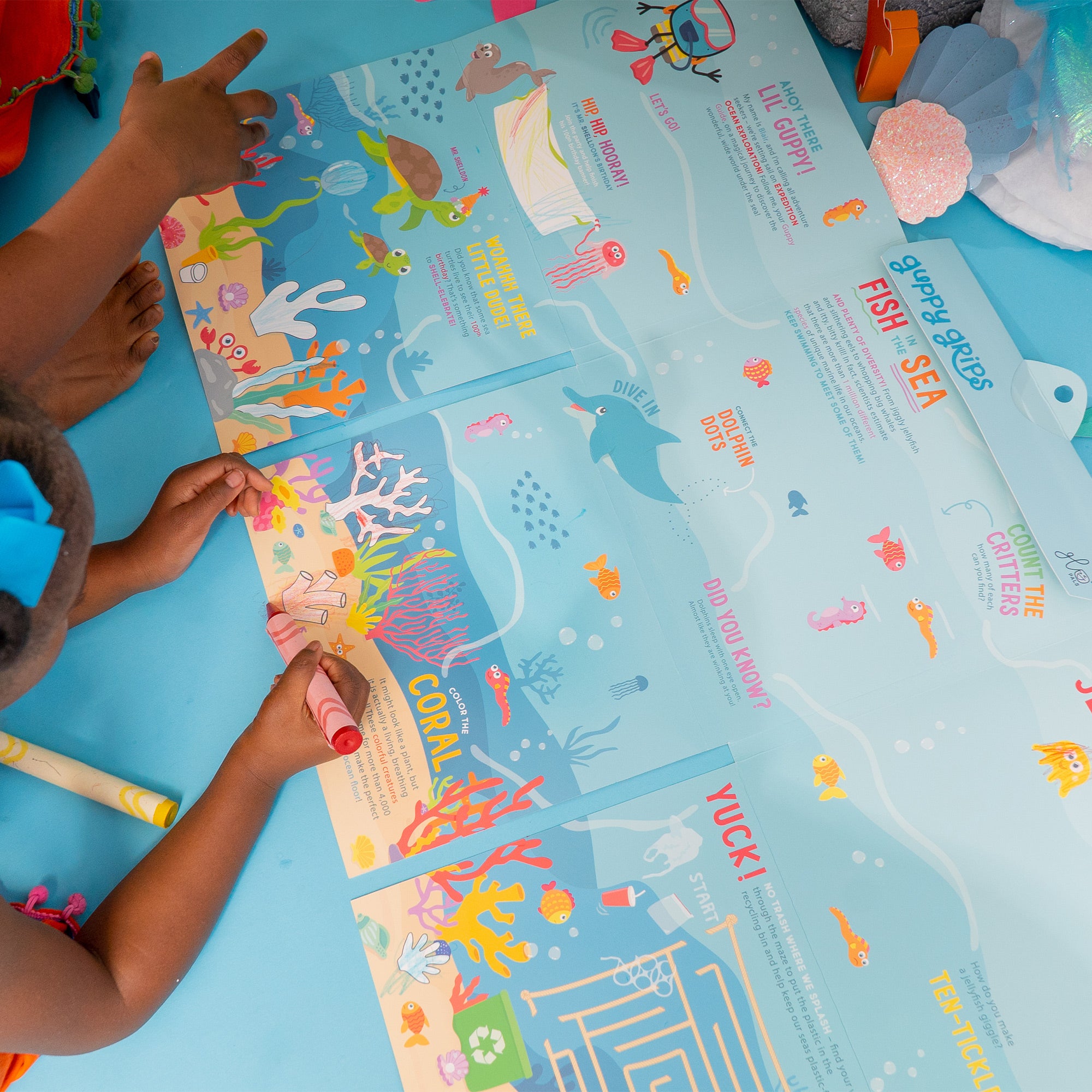 Transform bath time into an under-the-sea adventure with Guppy Grips - non-slip bathtub stickies designed with your little one in mind. The textured, non-slip surface is fun and functional, meaning more bath time fun and fewer slips + slides. Dive in and explore the wonderful wide, world of the deep blue sea with free, fun activities and learning resources inside our Galaxy Grip playable packaging!